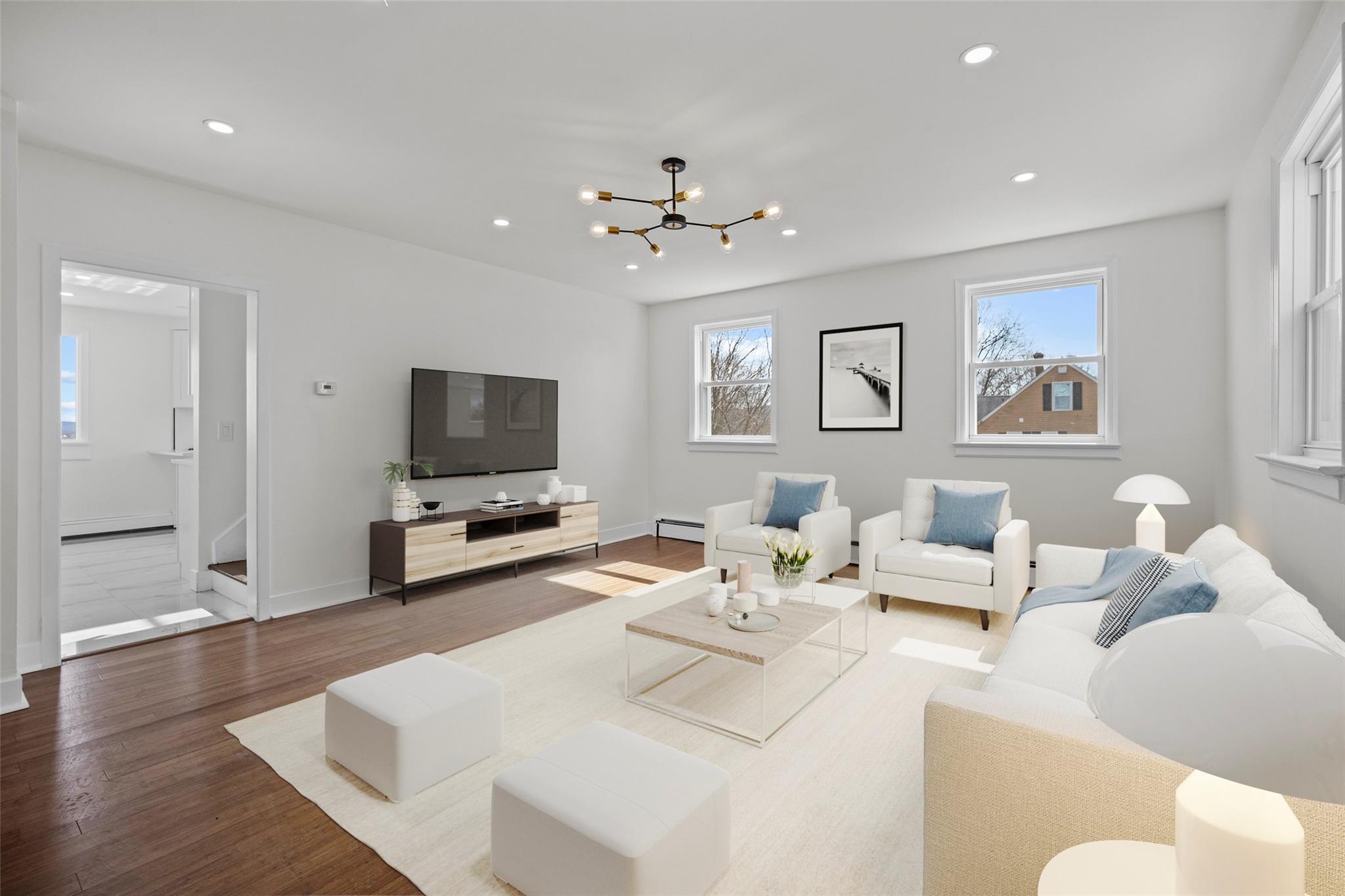 Step inside to a bright and airy interior featuring gleaming new hardwood floors, fresh paint throughout, and a fully updated kitchen —complete with granite countertops, custom cabinetry, stainless steel appliances, and a sleek tile backsplash. Porcelain marble floors throughout the kitchen, dining area, and corridor, create an inviting flow that’s ideal for entertaining and easy daily living.